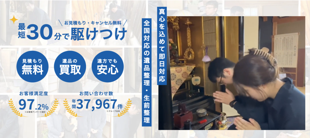全国対応・即日対応も可能な遺品整理・生前整理の専門サービスです。遺品整理士の資格を持つスタッフが在籍し、故人の大切な思い出の品を丁寧に仕分け、不用品回収から清掃、ご供養まで一括でサポートしてくれます。
